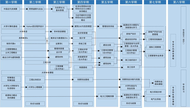 本专业学生知识结构建立在工程技术、工程经济、工程管理、工程法律和计算机科学与技术五大知识平台上,应具备工程力学、土木工程概论、工程管理导论、工程测量、建筑材料、施工技术、画法几何与建筑制图、房屋建筑学、施工组织设计、建筑结构、工程经济学、工程项目管理、工程造价管理、工程招投标与合同管理、建设法规、建筑CAD与信息模型等方面的基本理论和基本知识,同时受到较好的工程实践训练,具有一定的建设项目开发、设计、组织、运维和管理的基本能力,并具备综合运用所学知识分析和解决工程项目管理方面专业问题的能力,成为“基本理论+工程实践+能源电力特色+创新与运营能力”的高素质应用型和复合型专业人才。